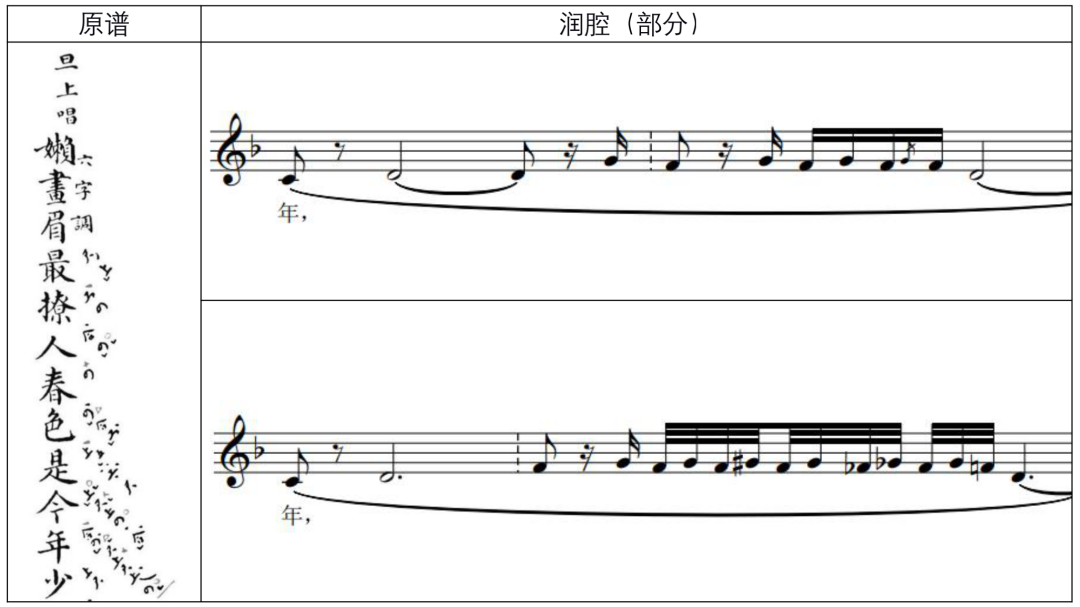 同时,为使音乐更具凝聚力,对包括润腔与律动两方面在内的原本唱腔音乐的简化似乎是不可避免的。作品《朝元歌》《步步娇》原本曲牌中与语言节奏密切相关的8/4拍自由律动变更为规整的4/4拍节奏,使得乐队与曲笛的配合更密切。在作品《懒画眉》长大的引子结束后,原本“最撩人春色是今年”中“年”字复杂的润腔(谱例2)随文字一起退场,头腹尾润腔的压缩为音乐的表现提供更多空间。