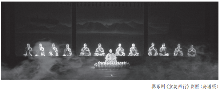 杨燕迪在谈论音乐新作因何而可听时,曾做如下理想状态的假设:“音乐新作应该以纯粹艺术性的原因吸引听者的耳朵。也就是说,听者之所以对音乐新作发生兴趣,是因为音乐新作提供了聆听旧作、阅读小说、观看电影等等不能替代的独特艺术感受和新鲜艺术经验。凭借这种不可替代的独特价值,音乐新作才有资格召唤听众,才有力量征服听者。”[13]如此而言,《玄奘西行》一剧,作为一部音乐新作,从音乐表演、舞台美术及思想性等方面,体现了一种综合性、多元化的视听体验,应该说,这是其值得肯定的艺术品格。