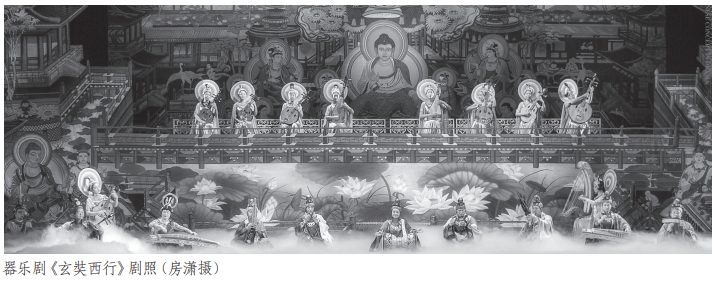 虽然该剧在戏剧性音乐表演、多媒体舞台呈现等多方面,与《印象国乐》和《又见国乐》具有一定程度的相似性,但是又有较大不同,该剧更具开创性和颠覆性。它在清晰的戏剧主线的贯穿下,让民族音乐呈现出多元、立体的综合性舞台语言,则是对中国民族音乐当代传承与传播而拓展出是新道路与新模式。核心人物——玄奘的西行故事是整部剧的主线,而乐器及器乐则是该剧的“主角”,主创者放大了民族乐器的叙事、表情和意象建构的功能,也赋予了民族乐器以特殊的身份隐喻,而这正是“民族器乐剧”的特点。