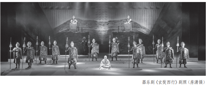 通常,我们赞颂经典,并非要回到过去,亦非厚古薄今,而是要通过“往回看”来反观当下的方方面面,进而使前行的脚步更稳健。《玄奘西行》一剧,从思想层面看,正是通过历史人物的经典故事关照当下,通过彰显玄奘不忘初心、不畏艰险、执着进取的伟大精神,表现玄奘探求佛法不只是唯一的目的,更是寻求人生的最高境界,超越生死、用心灵的思想意念去感召人与自然、人与人之间的善念之法,而这正是当今时代所需要的精神。该剧主要的故事情节,通过直接的“磨难”——“一念”“潜关”“遇险”“雪山”“祭天”,或“思念故乡”“以礼挽留”等间接的“磨难”——“问路”“高昌”“普度”“故乡”,从哲理层面对这种精神进行深刻的阐释。乐器间的冲突、对话及与人声念白的互动等,则在完成“阐释”上达到了形式与内容的统一。