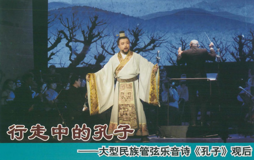 民族管弦乐音诗《孔子》将美声歌唱艺术与民族管弦乐队相结合,利用舞台空间调度,做出了富有创造性的舞台戏剧布局,丰富新颖的音乐表现、多元的审美情趣,无疑成为民族管弦乐艺术发展中的又一有益尝试。但就作品体裁名称而言,本应是以民族管弦乐队为主导的音乐叙述,被演出中大量声乐段落与舞台角色的化妆表演、频繁的舞台调度等因素所冲淡;在绝大部分段落中,"音诗"形式的主体性式微,乐队处于伴奏地位;加之作品中带有鲜明的舞台戏剧形式特征,因此使作品更像是一部由民族管弦乐担纲的清唱剧。