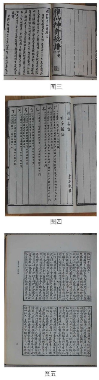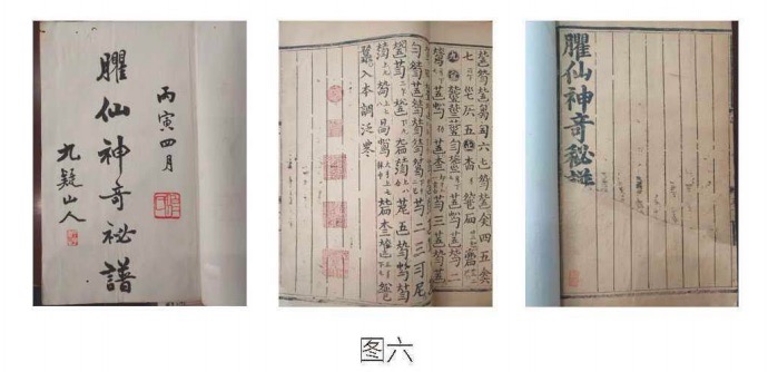 一般认为,目前存世的两种《神奇秘谱》,均非原本而是翻刻,北图本翻刻在前(约明嘉靖年间),上图本翻刻在后(约明万历年间)。另外,南京已故琴家王生香先生《〈神奇秘谱>指法一斑,附试拍初稿》一文中提到,他曾在南京旧书摊上见到《神奇秘谱》旧抄本,“因为索价太高,我没有力量买它,现在不知去向了”⑭。湖南省图书馆也藏有一部《神奇秘谱》,上卷缺失,仅存中、下卷。笔者曾于2017年5月前往查阅,书名由九嶷山人杨宗稷(1863~1932)题署,原为湘籍琴家李伯仁所藏(见图六)。经比对,与前述两个版本并无大的区别。