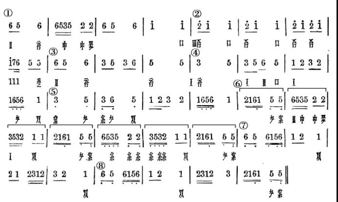 其一,徵调式八句体《八板》(之一),即钱先生所说的,省略引句,保留结句,乐曲从第3乐句开始,前两句移到结句之后,即“3+4+5+6+7+结句+1+2”。