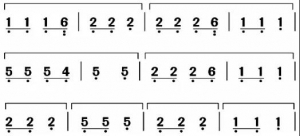 1、3、5、7是四种节奏模式,笔者曾称此为“数式节奏型”(见谱例15),在此依然保持用此称谓。