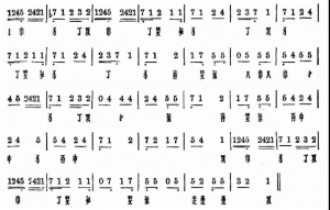 当然,对此曲的分析可能有不同意见,但是,在fa和si两音之间构成的增四度旋律特征是非常鲜明的,从中可以看出,在旋律移宫后,音阶类型也随之变化的可能性。