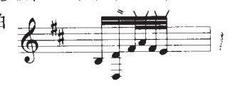 谱例第二音是“双弹”(按第四品中弦同时弹空老弦),音量很强,后半拍是四个32分音符,配用“弹挑”演奏,弹挑动作须快速,音量却极弱。如果此处“弹挑”用了手臂、手腕的运动,在快速的32分音符上很难弹出极弱的音量。这是由于用臂腕运动的弹挑,在音量强弱的控制能力上,比用指关节作主要运动的要差得多。