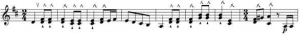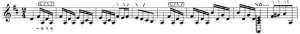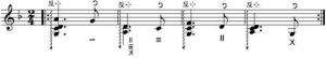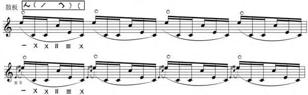),模拟风铃轻快灵巧的摆动声。然而乐声中并非只有孤零零的“风铃”,刘先生运用大、中、食三指的反正弹组合,表现出记忆中华严寺山门下泉水潺潺流动之声,于是就组成了带有无名指“侧锋正弹”与“反正弹”的多重技术组合(