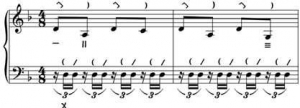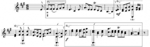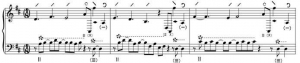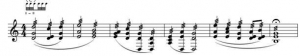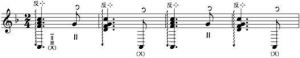 早期移植改编中外作品的经历,激发了刘先生对琵琶传统和声性语言的运用与开发:通过多样化地运用传统纵向和声语言,达到丰富音响的效果;逐步尝试提升右手中指在技法组合中的地位,以传统技法为基础拓展新技术组合。早期和声性语言的运用与开发,为刘先生此后的音乐创作积累了一定的经验。
