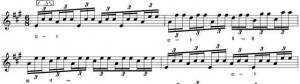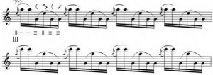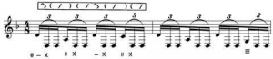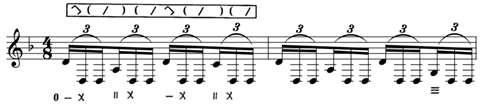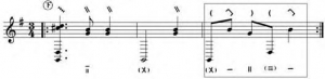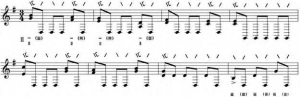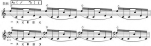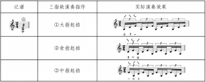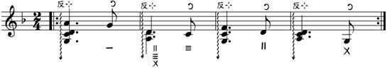 )视为“反弹”①。他借鉴西方吉他的演奏法,在技法“摭”的基础上加入中指,由大指“勾”、食指“抹”、中指“抚”构成“反弹”组合。乐曲运用三个手指的“反弹”,轻松灵活地驾驭四根弦的过弦。