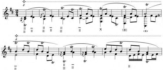 从下面的谱例中我们看到,在和音行进中,主旋律随着双弦四指轮在里外弦的变换而高低起伏,营造出明与暗的音色对比;装饰音的出现,为作品增添了一份萌动的生机,似乎是嗷嗷待哺的雏燕在巢内发出稚嫩的啼叫声,表达了新生命的呼唤。
