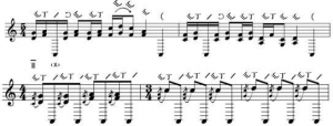 乐曲随后对该旋律进行变奏。刘先生在“弹挑”技法基础上,将中指“剔”、食指“弹”与大指“挑”组合,中指、食指分别与大指做“弹挑”状。新的技术组合()驱动手指在三根弦上快速过弦,中指“剔”音色坚挺清脆,在连续的快速分解和弦中突出外弦主旋律,增强了旋律动力。