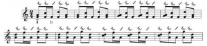 这一时期,刘先生有意识地开发右手中指与无名指技法,提升两个手指的独立性,根据传统的“摭分”开发的“反正弹”技法,此时逐渐进入到了发展期。右手大指、食指、中指、无名指四个手指各自一“正”一“反”产生八个“点”,成为打造琵琶新语言的基础。1996—2001年,刘先生陆续创作了十首风格别致的小曲(含《秧歌迪斯科》),取名为《乡土风情篇》。刘先生起用“反正弹”作为作品的核心语言,以指尖滚动的音响形象展现一幅浓郁的乡村田园人文画卷。在此,以其中三首小曲为例: