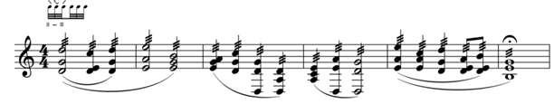 在此之后,刘先生又陆续在几首新作中将“新三指轮”进一步发扬,初步形成了“新三指轮”系统:三指轮中的大、中、食指均可以作为起拍,从而能够在里外弦实现不同音区的分解和弦及转位,由此产生丰富的和声音响,凸显了音乐的立体美感。以下面的和弦为例: