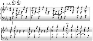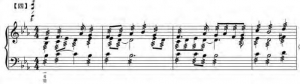 2018年刘先生专门运用和声语言编写了一首《和弦练习曲》。作品由四个乐段组成,每段分别采用不同的和声性语言。在首段刘先生再次启用“新三指轮”,配合左手和弦的转换和节奏的变化,在纵向和弦行进中,里外弦的横向旋律第一次出现了“对话”。
