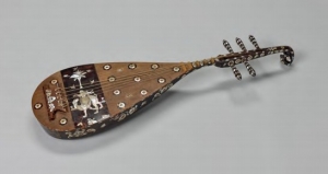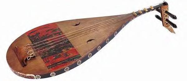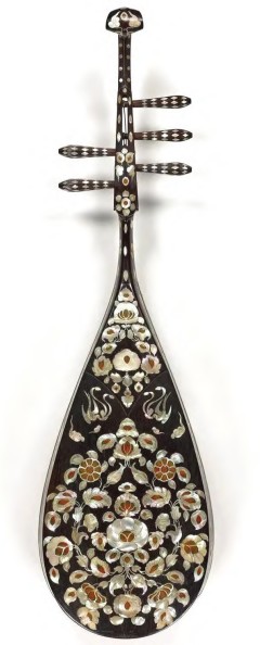 日本筑前四弦琵琶的曲项似乎大于90°,用黄扬木制作,用紫檀木制作弦轴。