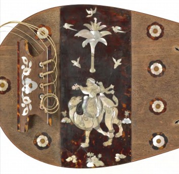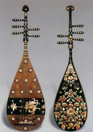 正仓院北仓楼下有一螺钿紫檀五弦琵琶,虽属千年古器,保存比较好,益以明治年间的修补,几乎恢复到完全的原形。通过这个,可以悉知唐制五弦的构造。此器表里都满面施有螺钿装饰,捍拨贴有玳瑁薄片,螺钿上表现着一胡人骑着骆驼,背向,弹着琵琶。真是光彩夺目的出色乐器。