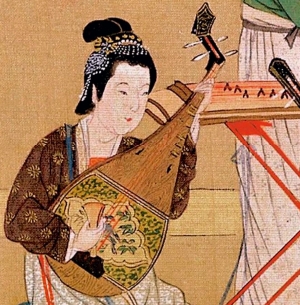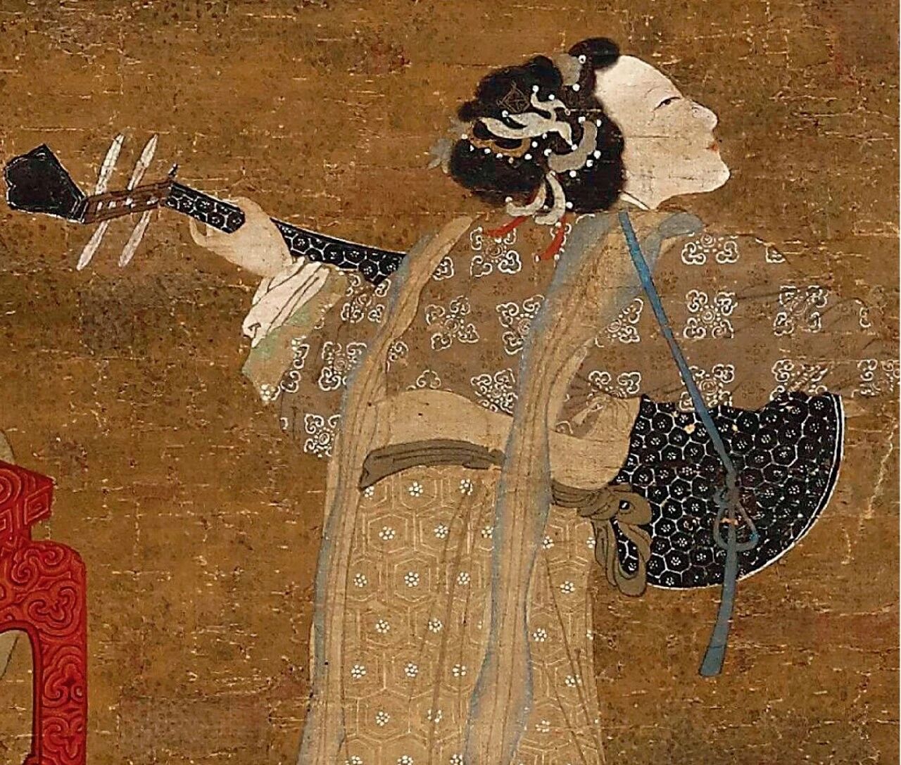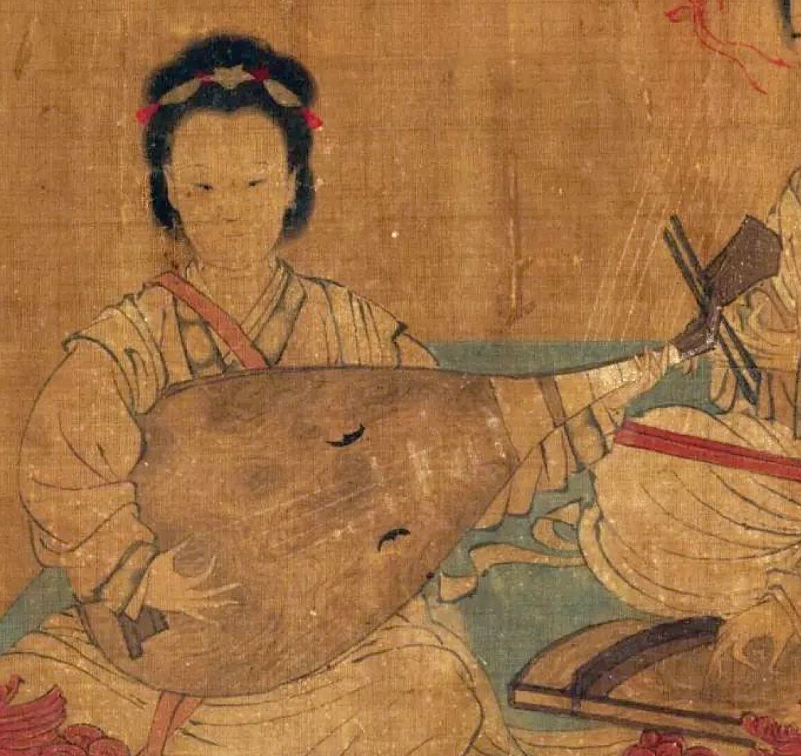 这根带子会不会像陕北琵琶一样用来固定其胸前琵琶?如果是,那这个琵琶的背部,是不是也会有两个像陕北琵琶上一样的“背扣”?如果这个推断成立,演奏者与琵琶之间的“中介物”为琵琶背板上的两个“背扣”和一条丝带,那么上述《宪宗行乐图卷》等图像中琵琶无法实现演奏的问题便迎刃而解。
