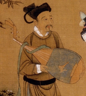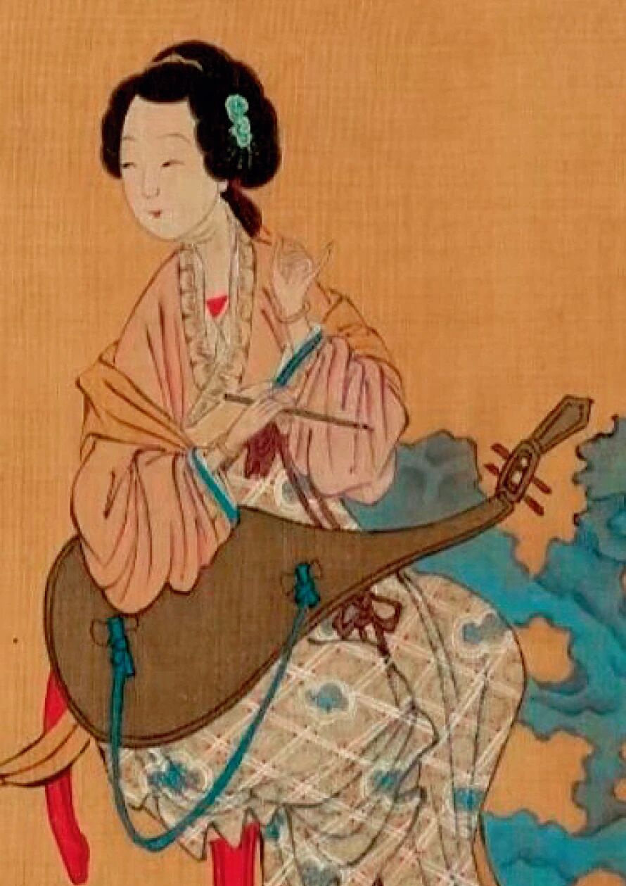 可见,诗文中以“绦”“紫绦”“彩绦”“绥”“红绶”等语汇描绘的担绦儿,并非系“死结”固定于椿楸之上,而是系活结,在演奏之前或需重“新整”理,演奏之后则“放拨解紫绦”。如此,上海博物馆《歌乐图》中绕琵琶琴颈而下的绿色丝绦便可理解,在非演奏状态时,未系在椿楸之上的担绦儿。并且,上述图像显示,诗词文献中以豆锡、抹金铜、玉、金、银等名贵材质制成的“担环”,非必备部件,担绦儿也常直接系在椿楸上,而非一定要通过担环。