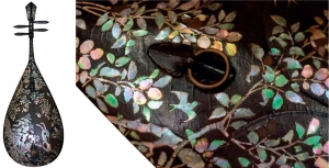 图16 明黑漆花鸟纹螺钿琵琶(左:官网图,右:黛玉洁拍摄)