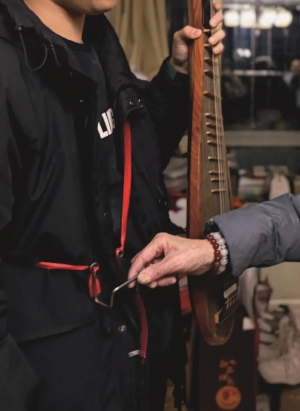笔者采访江南丝竹上海市非遗传承人陆德华老师时,他曾提及,江南丝竹行街时,会用一根红绳系一个腰托,把琵琶底部卡住固定在腰部演奏(见图22)。 40 这一方式与南音踩街时琵琶演奏的方式类似。这与《乐家录》中的“挂琵琶”是否有关联?