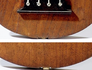 比《乐家录》早约半个世纪的《魏氏乐器图》中也明确立乐用琵琶 41 ,书中的琵琶图清晰地显示,琵琶底部有一个挂扣(见图23) 42 。相同的部件也出现在巴黎音乐博物馆(Cité de la Musique)(见图24,上下分别为琵琶正面和背面底部截图) 43 和英国罗素-科特斯艺术画廊和博物馆(Russell-Cotes Art Gallery&Museum) 44 藏中国琵琶上。这或许是《乐家录》载“挂琵琶”之另一种挂扣?日本将琵琶底部这个部位上护贴的锦缎称为落带 45 ,亦或是这个挂扣(button)功能的另一重证据?这一点仍有待进一步考证。