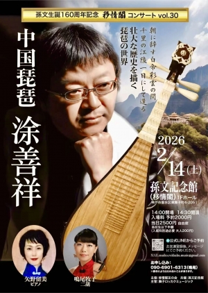 作品介绍:乐曲由著名琵琶演奏家涂善祥创作,是为纪念孙中山先生诞辰160周年而谱写的最新作品,于2026年2月14日在日本神户孙文纪念馆移情阁成功首演。