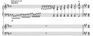 最后,也有三个部分体现出木兰英姿飒爽上阵杀敌的英雄气概。第一处在乐曲的第二部分“展开部”,在这一部分,乐曲结构主要分为“入侵”“出征”和“拼杀”三个乐段。其中,前两个乐段主要运用了左手的“(快速)换把”“滑音”技法以及右手的“快速弹挑”“连续扫佛”“摇指”“扫、轮、扫、弹、扫、弹、扫”等多种组合技法。模仿出面对敌军入侵,千军万马出征的声音,仿佛花木兰御马驰骋沙场的样子也跃然眼前,塑造出一个英勇上阵杀敌的巾帼英雄形象;第二处出现在乐曲“呈示部”的“副部”乐段,此处乐曲以活泼的小快板形式展开,由琵琶与钢琴的“一呼一应”发展进行,描绘出木兰练武时英姿飒爽的精神面貌,其中右手大段的“十六分音符”快速弹挑也为乐曲的向前发展起到推波助澜的作用;第三处出现在乐曲“展开部”的“拼杀”乐段,在这一部分强烈的“扫拂”技法拉开了战争的帷幕,左手“滑音”与右手“扫拂”技法,与前面的“摇指”形成鲜明对比,也将整个乐曲的氛围推向了最高潮。在这一段,乐曲整体的力度和气势上都变得更强劲,展现花木兰在战场上彻底忘却生死,只剩驱逐敌人、保家卫国的情态。