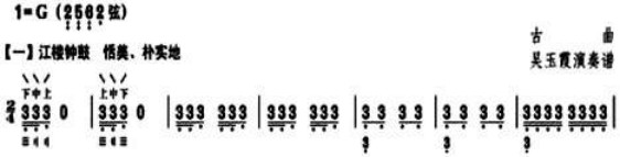 另外,右手演奏位置的变化也是该教材作品中所反复强调的重点。在《春江花月夜》(吴玉霞演奏谱)中,文论部分清晰阐述了对右手触弦位置的详细说明,即“下、中、上”和“上、中、下”的微妙变化。其中,“上”指的是左手按音的琴品部分,“中”则位于琴品和右手常规演奏位置之间,“下”则是靠近覆手的位置。这三个不同的触弦位置产生了柔、中、硬三种不同的音色效果。在教学中,学生需要明确的是,上下触弦位置变化的原因与艺术表达之间的关系,以及每种弹法设计背后的深层原因。此曲除了注重触弦点的变化外,对同音不同弦序的安排也进行了巧妙的构思。例如,乐曲开篇的三个同音,在两次重复中出现了三二二和三二三的弦序区别。这种详细的标注及文字说明充分展现了吴玉霞对艺术的严谨与考究,在教学中具有极高的实际应用价值。