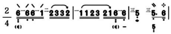图2为旋律记忆指法设计:《春江花月夜》第27小节,为了突出旋律的连贯性和便于拉弦的掌控,指法的设计由“la”一指接“do”一指,这是设计完全为了旋律服务和记忆。