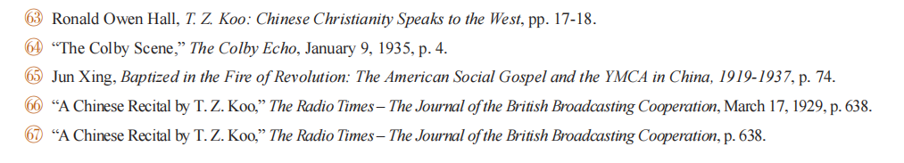 顾子仁(TsZungKoo,常简写为“T.Z.Koo”,1887—1971)这个名字,除了专门研究中国基督教学生运动的少数中国近代史学者和关注中国基督教圣乐本土化的专家偶有提及外,[1]知道的人可能不会很多,尤其是在近现代音乐史学界,顾氏可以说是个完全被遗忘的人物。虽然自1920年起,他即以中国青年协会代表和世界学生基督教同盟干事的身份开始在世界各地“奔走旅行,巡回演讲之中,席不暇暖,大有墨翟‘腓无胈,胫无毛’之概。……旅行欧美各国先后达二十年”“环绕了地球至少四次,巡访过千万所学校”,足迹遍及近五十个国家,尤其是在北美洲他演说家的声誉更是如日中天。“他早于一九二七年从纽约州的柯格德大学获得荣誉博士头衔。后来又有两间大学(DenverUniversityandLewisClarkUniversity)赠以博士学位。‘Dr.T.Z.Koo’的大名,在美国真可谓‘家喻户晓’”。[2]更有意思的是,“酷嗜音乐”的顾子仁“每于公开演讲之先,出其袖中所藏(顾氏经常着中国长袍,甚至在欧美旅行亦然)的短箫,当众吹奏一曲,抑扬顿挫,潮落波兴,使会众先以心动神怡”[3]。至迟在1928年,即赵元任在上海商务印书馆出版被誉为“‘五四’以来第一部融会中西音乐艺术的歌集”[4]的《新诗歌集》、李伯英在上海光华书局出版其所编《民间十种曲》的那年,出身“通常不大注重国文”的教会学校、英文比中文好[5]的顾子仁就“将中国民间流行的歌曲,选采其典型者,一一调为西方式的五线乐谱”[6],编辑出版了日后在海内外广为流传的中英文本《民间音乐》[7]。虽然顾子仁是民国时期最早将中国民间音乐传播域外者,也是最得力且最有影响者,但国内外学界无论对其人或其在海外传播中国传统及民间音乐之事工都没有专门的研究。除了与顾子仁“有五十多年的友谊”,且“曾经多年共事”的老友——哲学家、基督教思想家谢扶雅(1892—1991)在顾氏逝世后对顾氏其人及其《民间音乐》有所简介外,国内外学界不仅迄今仍没有任何专门的研究,就连近代史辞典(如《民国人物大辞典》)和音乐辞书(如《中国音乐词典》)也未列有关他的词条。
