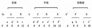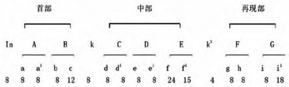从曲式结构看,《幽草》一共有三个部分:第一部分由引子引入,主要使用了下行音列及属和弦元素。下行音列元素在引子中出现了两次,有突出强调、加深旋律影响的作用。属和弦的运用为第一乐段的引入做了必要的和声准备(此处为属主呼应)。第一段主要由两个乐句构成,两个乐句长度都为8小节,第二乐句在保持第一乐句节奏的基础上进行了音程变化,使旋律稳中求变,巧妙地进行发展。第二乐段两个乐句头部材料都源于第一乐句材料:第一乐句主要使用第1—2小节节奏进行展开,第二乐句主要采用第3—4小节下行音列进行展开。值得一提的是,虽然第二段头部材料源于第一段,但第二段加入了新的音乐元素,如前十六后八节奏,与第一段形成了对比。第二部分主要由间奏和三个乐段构成,间奏主要采用两次反复构成(第一次为原样反复,第二次为低八度反复),并用音阶上行顺利引出下一个乐段。三个乐段材料完全不同,为并列的单三部曲式。第三部分两个乐段材料为新材料,两个乐段形成了对比。因此,此曲为并列性的复三部曲式结构。曲式结构如图1。