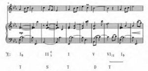 在谱例1的第1—2小节,第9小节使用了I9和弦,在第8小节使用了VI11和弦,这两个和弦都是高叠置和弦。这些和弦都是由于加入了二级音F而形成的高叠置,二级音的加入使和声色彩更加不协和。另外,此曲在和声序进上完全符合传统和声的序进,如谱例1第1—4小节使用的是主功能到下属功能再回到主功能的进行,第5—10小节使用的是主功能到属功能再到主功能的进行。