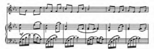 此外,本曲旋律中还频繁出现了全十六的节奏,如谱例3第5—8小节。这样的节奏伴随音阶上下行使旋律非常有气势。