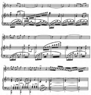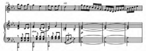 同样,钢琴的演奏在速度、力度、语法上与箫的演奏基本相同,不同的是震音、琶音奏法、和弦音及踏板的使用:如在本曲第105—108小节钢琴声部的低声部中使用了震音,在演奏时震音要均匀、流畅,而且要进行渐强处理来烘托音乐气氛。又在本曲的结尾处多次使用了琶音奏法,在演奏时要从低到高依次均匀且快速地弹出。在本曲钢琴声部的高声部中还使用了很多和弦,这些和弦都要弹齐,而且弹的时候要用“掐”的方法进行演奏,之后放松。虽然,本曲乐谱上没有踏板标记,但并不是在演奏时就不用踏板,而是需要根据乐曲合理搭配延音踏板的使用,如在演奏本曲第一段时我们可以根据和弦的转换,一个和弦使用一个音后踏板,这样会美化音色。但需要注意的是,在踩踏板时要轻一些,不要因踩踏板太多而使声音浑浊而影响整体音响效果。