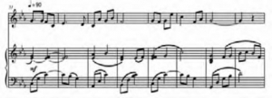《幽草》的旋律特点主要表现在节奏的变化及音高的排列上:如在本曲例1中旋律使用的节奏主要是“四分音符+两个八分音符+二分音符”,这样的节奏有缓缓展开之意。[2]在运用这样的节奏的同时音高也进行了变化,主要通过三度小跳和级进展开旋律。再如在本曲中还频繁使用了平八节奏,这样的节奏结合6次六度大跳,使旋律进一步展开,旋律蕴含的情绪也随之而起,详见谱例2。