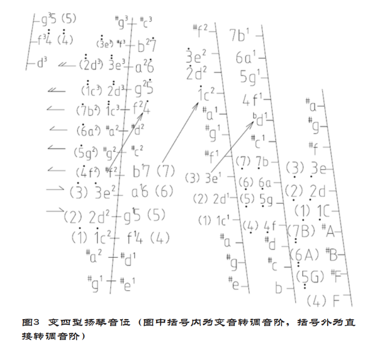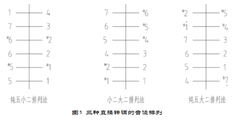 建国初期,扬琴革新者们几乎一致抓住转调这个要害问题开展工作,采用的方法大致可分“直接转调”和“变音转调”两类。革新者们先后设计有三种直接转调的音位排列形式。