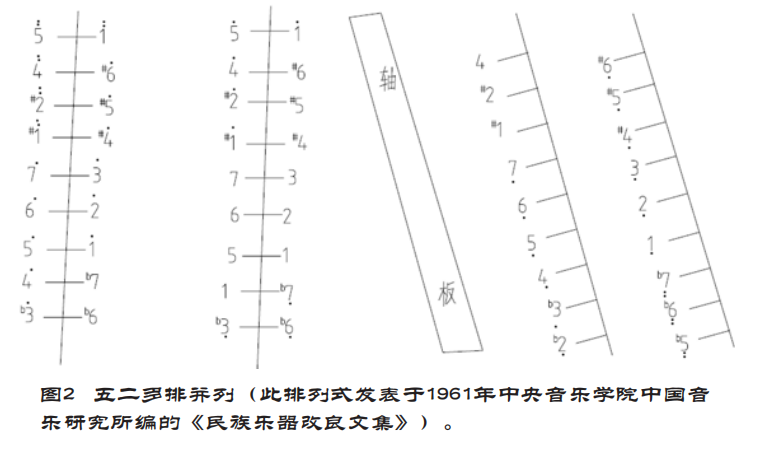 “五二”代表上述直接转调中的纯五度,大二度排列法。“多排并列”是指突破旧式扬琴的双排并列而发展成三排,四排,五排等的并列形式。“五二多排并列”扬琴是一种直接转调扬琴,排列形式如图2。