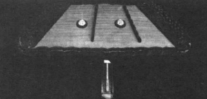 小转调扬琴是由杨竞明先生与北京民族乐器厂在1939年前流传较广的“双十型”扬琴(见图2-1)基础上,增设一条马而成。其音域由G-g2转变为c-c3(见图2-2),同样约为三个八度,相比之下音域整体向上移纯四度,但在小转调扬琴中增设更齐全的半音,音数由30音扩展为39音(其中#c¹、#d¹、f¹、#g¹、#a¹为同音异位),但舍弃了低音G、A、B。这样的音位排列更有便于演奏者演奏转调乐曲,但音域上还不能够满足演奏者的演奏需求,因此在三排马小转调扬琴的基础上又研制出四排马大转调扬琴。在1959年乐器改革展示会(中国音乐家协会主办)上,杨竞明先生首次公开自己的三大发明:1、五二多马并列式,2、分层滚轴板,3、转调半音槽(变音推车)。这三样发明是中国扬琴改革史上的重大突破,在小转调扬琴形制上已有应用。