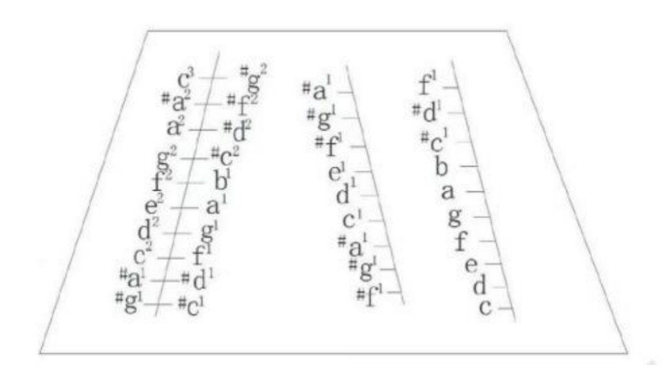 此时扬琴琴体特点显而易见:共鸣箱较小,双排马,外形梯形或蝴蝶形,以及右图所示的音位排列,这样的形制特点决定了这一时期扬琴音量小、音数少、音域窄、调音难、转调难的特点。