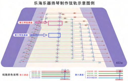 有一点需要说明,弦轨是根据音位排列的需要而派生的技术环节,是音位形成的基础条件。如果是研究欧洲的扬琴,它以纵向扩展为主,始终保持双弦轨的特点,弦轨研究无实用意义。而中国扬琴改革的横向扩展过程中,产生如此多元的弦轨概念是中国扬琴制作实践需要的。例如金翎601型扬琴为扩展音域而增加的六排琴马设置;龙吟扬琴与虎啸扬琴右下角有特色的低半音马音位;云莺扬琴和凤鸣扬琴在高低音区的音位增加等方面,都有着弦轨设计的考虑,凡生产实践中需要的内容均有思考研究的意义。