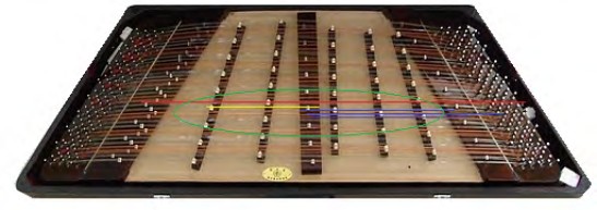 在中国扬琴由两排琴马发展到四排甚至六排琴马的过程中,弦轨概念一直是被忽视的。演奏员也觉得这没有什么可重视的,因为看到的多是均匀分配状态,没有发现异常。甚至有些扬琴经改革明显地调整了弦轨顺序却在音位表上看不到区别。例如,以广东陈照华先生等人研制的1978年获文化部科技奖的“红棉牌十二平均律扬琴”(下称红棉扬琴)为例。它有中国最早在原扬琴高音琴马左侧又增加一排倍高音马的设计,摆在原高音琴马左下的方向,实际上形成了第二弦轨的状态。它在最初的四排琴马形态时,自左排列弦轨的顺序为二、一、三、四,增加至五排琴马后,仍保持了二、一、三、四+五这个特点(这里弦轨的顺序仍以401型扬琴的高音琴马条为第一弦轨。)1981年初,笔者曾建议陈老师将高音琴马与倍高音琴马对调形成左起一、二、三、四的弦轨顺序,并动手完成。但生产厂家因产品获奖已经定型不同意改动。据研发者陈照华教授介绍,这种琴的弦轨变化是为了演奏广东扬琴作品时呈现“扬琴演奏八度时双手呈一条平线”。因此,现在看来,它的高音琴马与增加的倍高音琴马的弦轨设计是倒置的,也就是高音琴马条占第一轨,倍高音马条占第二轨,把中音、次中音和低音琴马条保持在第三、四、五弦轨。图2中,红线表示的是原高音琴马线路,为第一弦轨,黄色为新增的倍高音马为第二弦轨,“中、次、低”马条仍为蓝色的三、四、五弦轨。