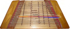 改良型501型扬琴(琴马数量有变但弦轨规律不变),图4中黄色为新增琴马条为第一弦轨,红色为原高音琴马弦轨,其它顺延为三、四、五弦轨。501型扬琴五排琴马条的纵向排序沿用了左上右下的习惯,黄线表示的倍高音马条的弦轨在原红线表示的高音琴马弦轨左上位置,实际上成为了第一弦轨。因此,其弦轨按左上右下排序法定为第一弦轨。501型扬琴的弦轨顺序为左起一、二、三、四、五。