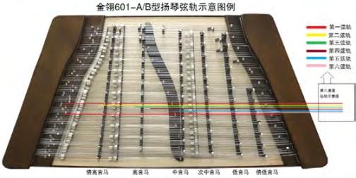 在以传统工艺制作的扬琴品种中,琴马条最多的是“金翎601-A和601-B型扬琴”。这种六排琴马的扬琴在弦轨设计中,保持了传统的左起一、二、三、四、五、六弦轨对应六排琴马的规律。正因为弦轨设计顺应了中国扬琴弦轨概念的基本规律,使音位排列与演奏手法和402扬琴的演奏手法完全相同,易于具有402扬琴演奏基础的人使用。图6为音域宽且演奏方便的金翎601-A、B型扬琴弦轨示意图。