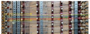 如图2与图3所示,红棉扬琴五排琴马的弦轨顺序为二、一、三、四、五。黄线表示新增加的倍高音弦轨在原红线表示的高音琴马左下位置。