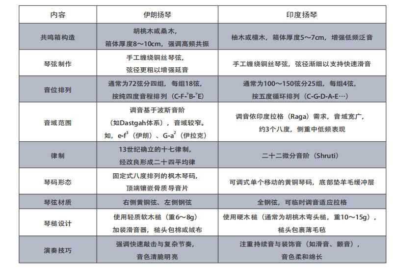 的复杂音腔,此种律制并非严格的数学分隔,而是基于人耳对音程的心理感知。固定音码与活动音码的构造差异,直接反映了伊朗与印度不同文化中不同音乐需求:伊朗音乐追求宗教音乐的肃穆感,印度音乐注重人声化的情感表达。而这些音乐需求更是塑造、熔铸并体现在扬琴乐器构造的各个层面,形成了两种从共鸣箱构造、琴弦制作、音位排列等具体特点完全不同的民族乐器(具体内容如下表所示),尽管存在诸多差异,击弦、梯形共鸣箱等共同特征依然是它们同属世界扬琴家族的类型学依据。