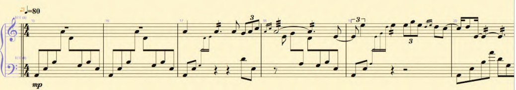 在扬琴作品《原风》的“情歌”片段(谱例1)的实际演奏中,至少有三处需要有明确带动动作来提示句法的连接。其一,弹第一个音之前的带动。整段音乐为流畅的中速,深情的情绪,力度要求在中弱中强之间,因此开头的动作不用带动得太大,能够明确提示出右手伴奏的开始进行即可,而后的五个小节八分音符可以不用右手大幅度的带动动作。其二,第三小节左手旋律的带入。作用同前,左手的带动动作明确提示出旋律的引入进行。其三,第四小节最后一个八分音符E之前、A之后。这里是整段旋律分句的地方,左手动作的带入能够提示句法的语气转换。另外,E前面的A轮音不要轮满一拍半时值,为E前的带入动作留出时间。