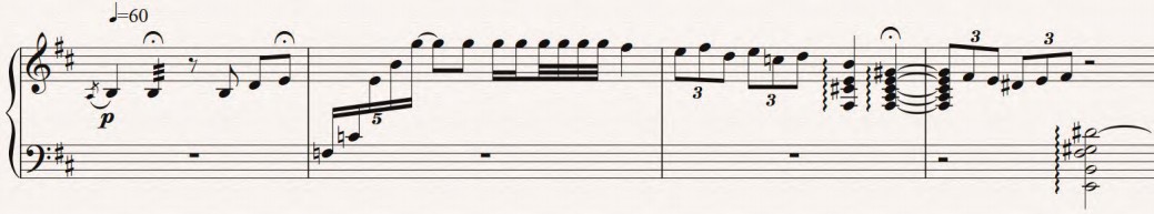 在《狂想曲》的片段(谱例2)中,“带”的作用就不止于起拍提示,更多的是起着表情达意的作用。第一小节有两个延长音记号,第一个记号处由于演奏轮音,时值自然得以延长;在第二个记号处是e的单音击弦,没有任何技术难度,却明显带有作曲家的情绪转接意图;再者,延长音记号本身就带有“让时间停止一会儿”的意义。所以在弹完这个E以后,需要有个缓慢的“带”的动作来连接下一小节的F。同样,第三小节最后一拍的琶音,也是如此处理时值和动作的关系。这个例子中的“带”是在击弦发音以后做出,其作用是延迟音符之间的时值连接,象征着“犹豫、缠绵、内敛、沉静”等情绪的表达。