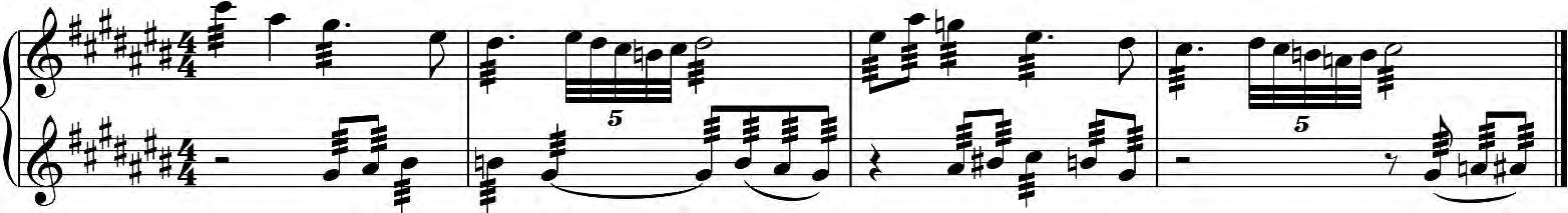 如中古调式的《炫·光》,以及爵士音乐风格的《狂想曲》《枫叶的幻想》等。同时,也引入现代作曲技法的人工音阶,如:全音阶创作的《觅》(见谱例1);半音阶片段式创作的《海燕》(见谱例2)、《川江韵》、《鸟之舞》等。扬琴具有固定音位排列、半音齐全以及可任意转调的特点,现代作曲技法使扬琴音乐作品在音阶与调式上的转换及结合有着更多的可能性,包括离调、转调、调性转换、双调性等,也为未来的发展提供了广阔的空间。
