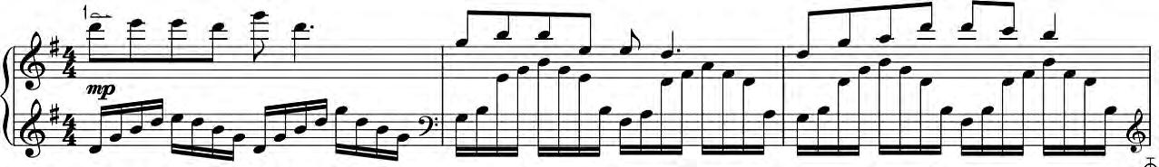 扬琴单声部音乐主要采用单竹、轮竹、八度齐竹等技法演奏。带有多声部效果的单声部织体是扬琴独特的表现方式,常见于快速分解和弦、坐音与衬音等加花变奏中,如《阳光照耀着塔什库尔干》(见谱例9),其旋律隐伏于分解和弦之中,也成为扬琴炫技的表现手法之一。多声织体中,左手旋律与右手伴奏是扬琴主调音乐织体中最为常用的写作手法,如《渔岛月夜》(见谱例10)为了使旋律声部更加突显,常用不同音色的演奏技巧呈现,伴奏形式采用多种音型化织体,常见的类型有分解和弦、固定音型等,也有同时发出多个音高的手指拨弦、双音琴竹等技法呈现出柱式和弦织体。复调音乐织体在扬琴独奏作品中体现于双手独立演奏两个声部,并有着对比复调与模仿复调的创作手法,如《竹林涌翠》《天山诗画》《潮乡行》《秋·梦·藕》(见谱例11)等。此外,多声织体的创作手法还拓展至扬琴重奏形式与不同乐器组合中,产生出更多独立又相互协调的旋律线,增添了音乐的复杂性与动态性。