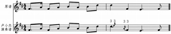 首先,卢小杰十分注重弓速的变化。例如,在演奏双回滑音时,在保证节奏平稳的前提下,弓速需呈现快—慢—快的变化——即音头部分快、中间慢、音尾再加速,通过弓速变化与滑音弧线的虚实配合,形成实—虚—实的艺术效果。这一处理手法实化了起音和落音,对滑音过程作虚化处理,使滑音音色富于变化且余韵深长,具有鲜明的江南音乐风格特色。如果不注重弓速的设计和变化,运弓平铺直叙,则双回滑音会体现出中原地区的音乐风格,造成地域风格上的混淆。